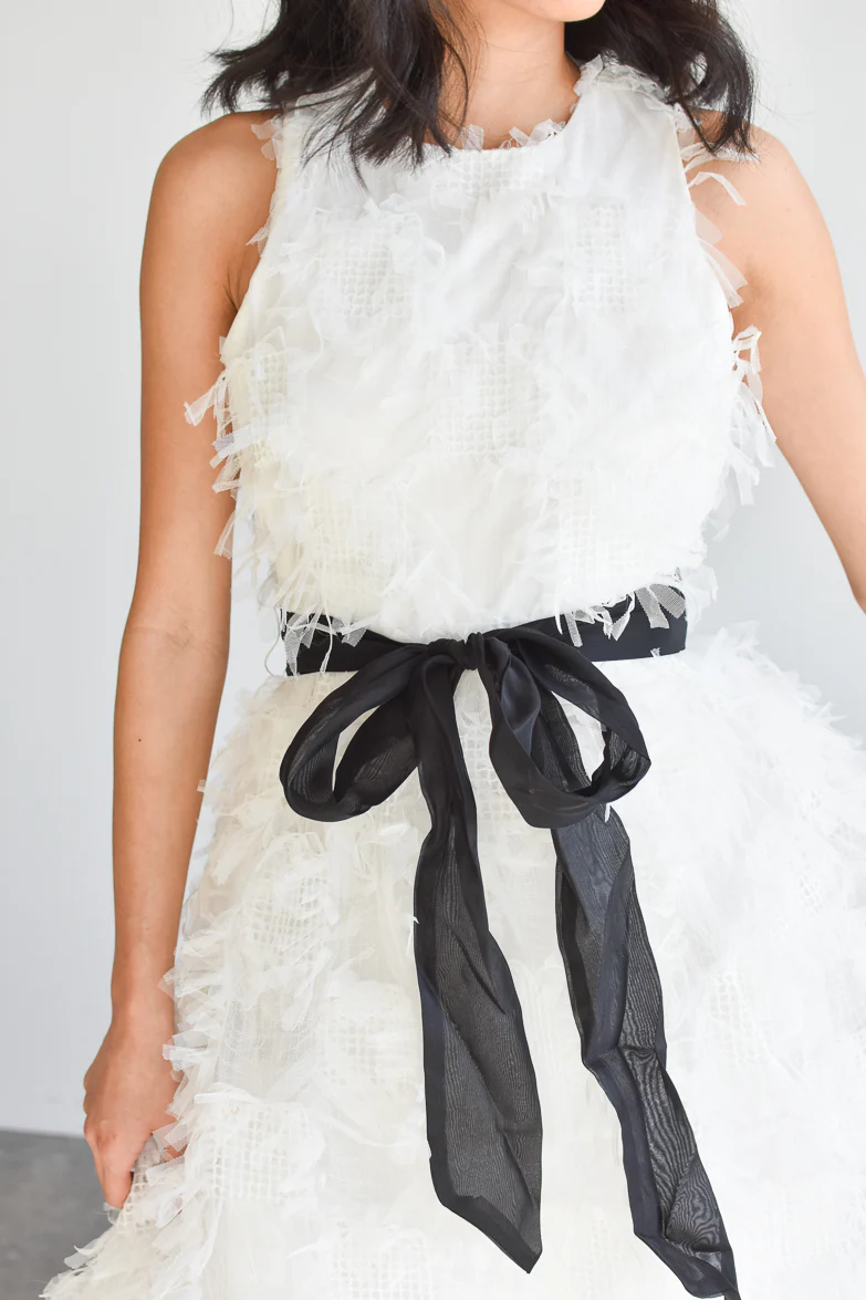Classic and chic, the Audrey 3D Fringe dress is a ankle length style maxi that is crafted from a soft 3D fringe textured fabric. Its high neckline and full skirt gives Audrey a vintage feel. Optional black bow tie belt. Available in white and black. Hidden zipper back. We're pairing with a high pony and ballet flats for a cold weather dinner date.