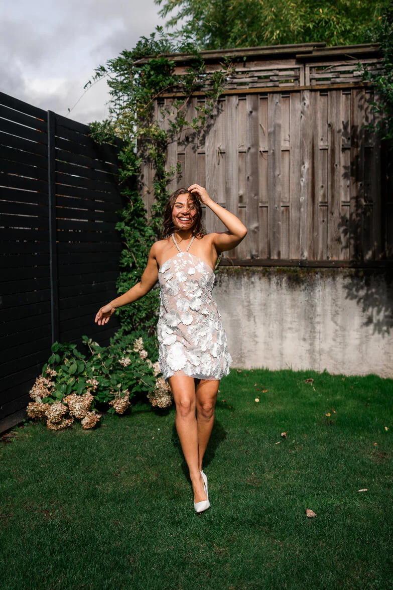 Turn heads at your bridal shower with the Callista Floral Lace Mini Dress from Elliatt! An a-line silhouette and dimensional floral embroidered fabric make for a flattering and stylish look. Halterneck. Hidden zipper back. The faux pearl neckline elevates the look.