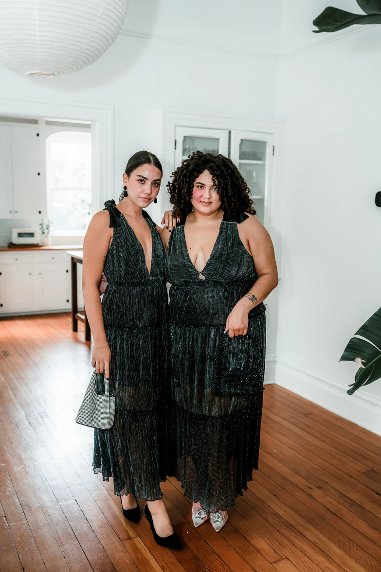 Our Halle Shoulder Tie Deep V Maxi is the epitome of sophistication. It features shoulder-ties and soft knit stretch metallic fabric. Available in both silver and copper. Half lined. This style makes the most epic wedding guest dress or holiday party dress.