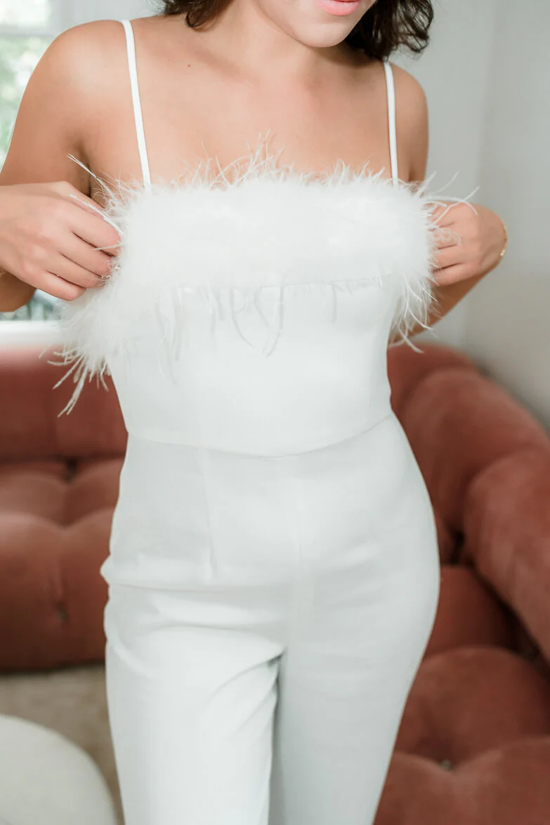 If you're looking for a stylish bridal jumpsuit, try the Isolde Feather Jumpsuit from Elliatt. This classic white jumpsuit features a playful feather trim across the chest and adjustable spaghetti straps for a perfect fit. Crepe fabric. Hidden zipper back.
