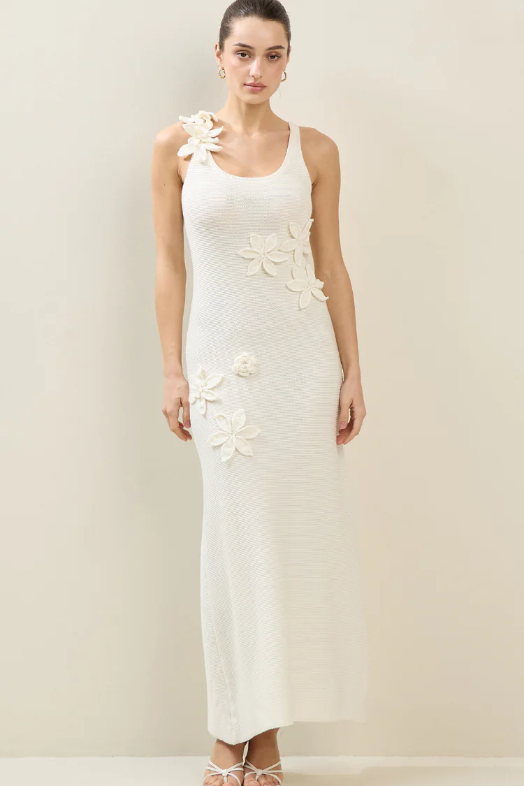 Your dream beach vacation dress awaits in our Koh Samui Crochet Midi Dress. Available in cream and pink, this ankle length stunner is crafted from a mid-weight knit fabric and is adorned with decorative 3D florals. Its soft scoop neck gives it a classic and feminine feel and makes it effortless to wear. Pullover style. This beauty is perfect for summer date nights, your honeymoon or a tropical vacay.