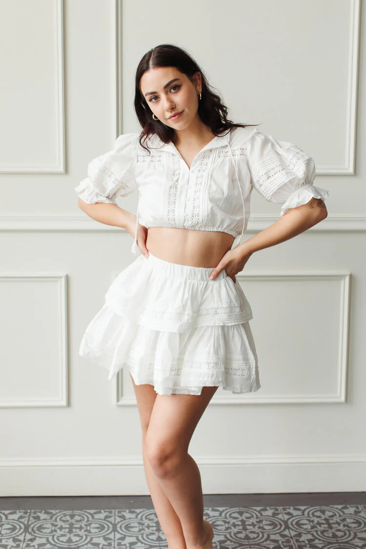 A classic white two piece, our Kent ruffle skirt set is cut from 100% cotton, adorned with inset panels of decorative floral embroidery. The slip-on ruffle mini skirt has an elasticized waist-band, while the crop top features blouson shoulders, button down styling and is finished with fun and flirty tassels. We love the versatility of both pieces.