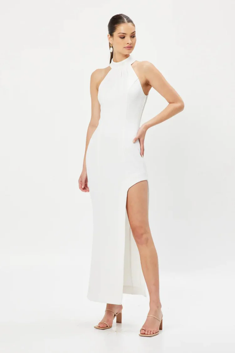 The Miniata White Halter Gown from Elliatt lends a touch of 90's nostalgia for the minimalist loving bride. We love this sleek, modern white maxi for a rehearsal dinner or engagement party. Featuring a fitted halter silhouette and thigh high slit. Textured fabric. Fully lined. There is a fair amount of stretch to the fabric.
