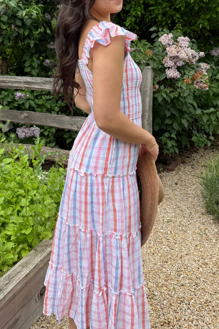 A piece that you'll live in all summer long - our Vero Midi Dress is cut from the most fun, candy-colored check print fabric. Featuring a smocked bodice, flirty ruffle shoulders and tiered skirt, this is the ultimate statement sundress for easy weekend brunches and summer BBQ's. Pictured in S and L.
