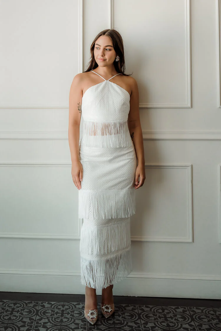 Perfect for brides looking for a standout party style. The Water Lily Set from Elliatt is our pick for an epic engagement party or wedding after-party outfit. Cut from a linen and sequin blend fabric, this two piece matching skirt set features a halter style top with delicate fringe and a sheath style midi skirt with tiers of sequin fringe.