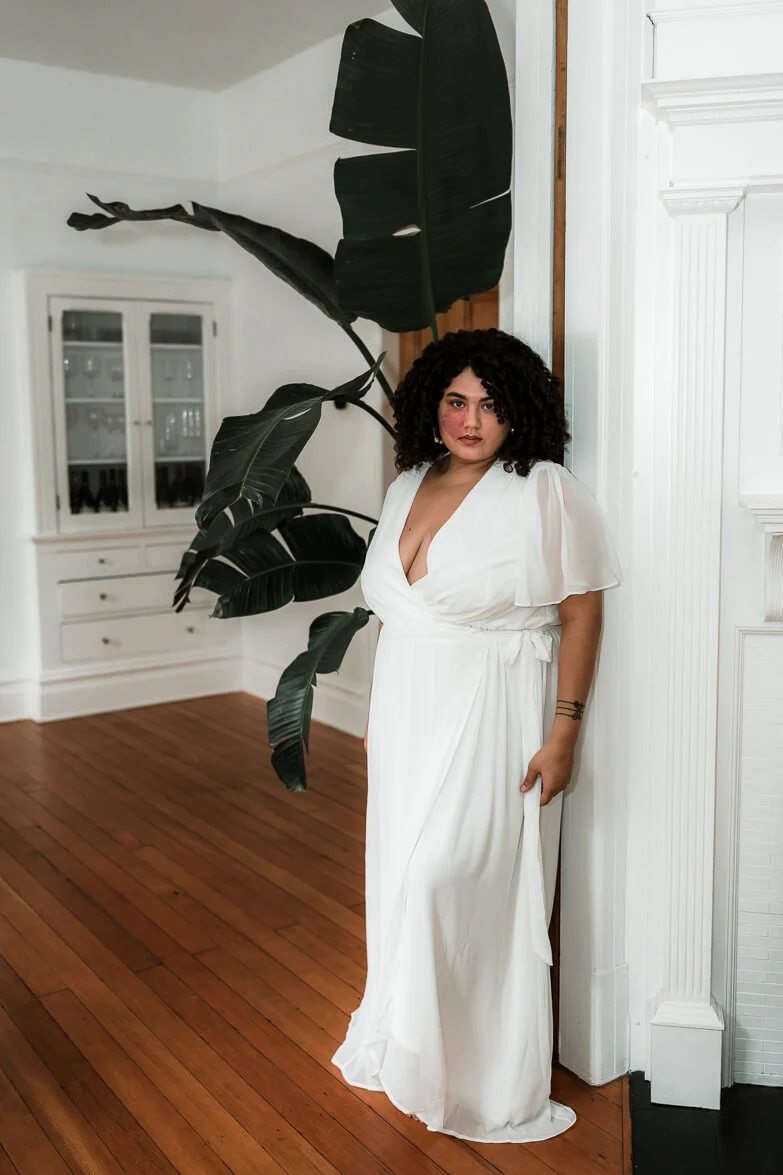 The Kyla is a timeless classic white maxi dress for our plus size brides. Classic wrap style silhouette with tie waist. Deep V neckline. Fluttery kimono sleeves gives it a touch of romance. Lined.